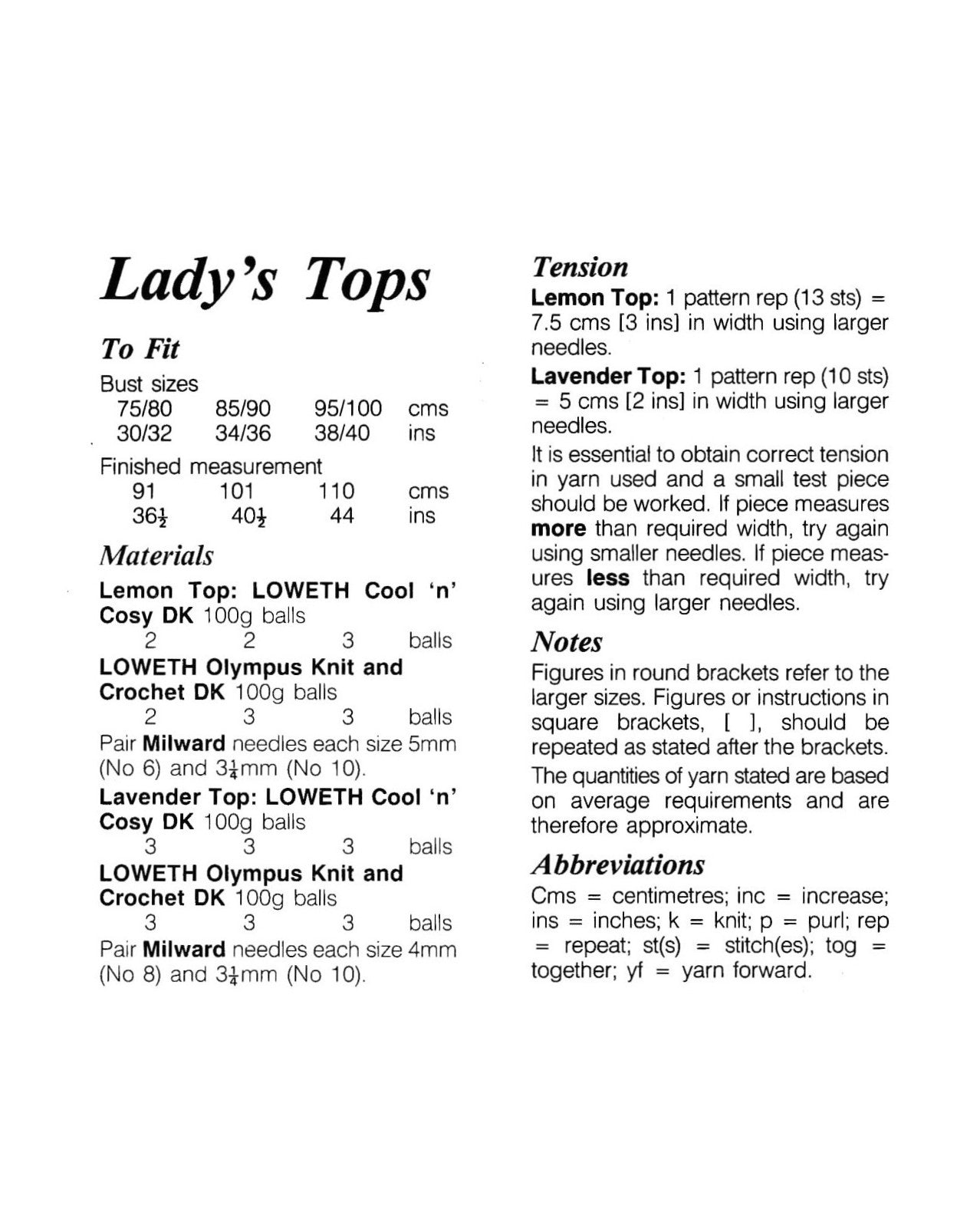 Instructs for 3 sizes; to fit busts 30/32 ( 34/36, 38/40)".