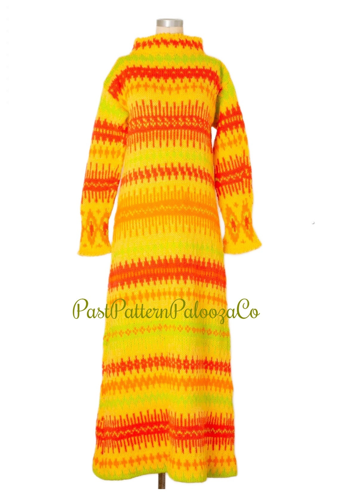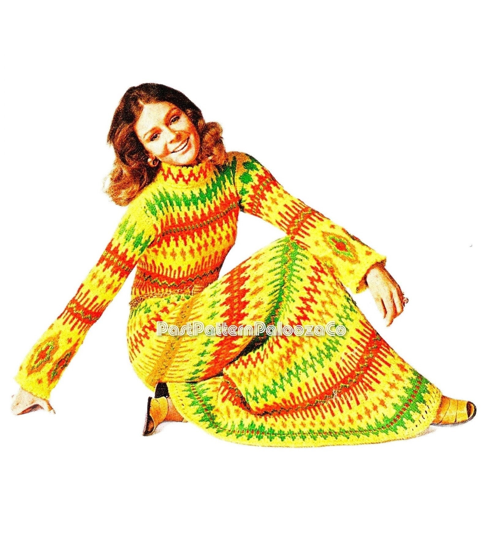 Offering a vintage digital PDF knitting patterns to make a stunning, Retro '70s long jacquard maxi dress in 10 ply :)