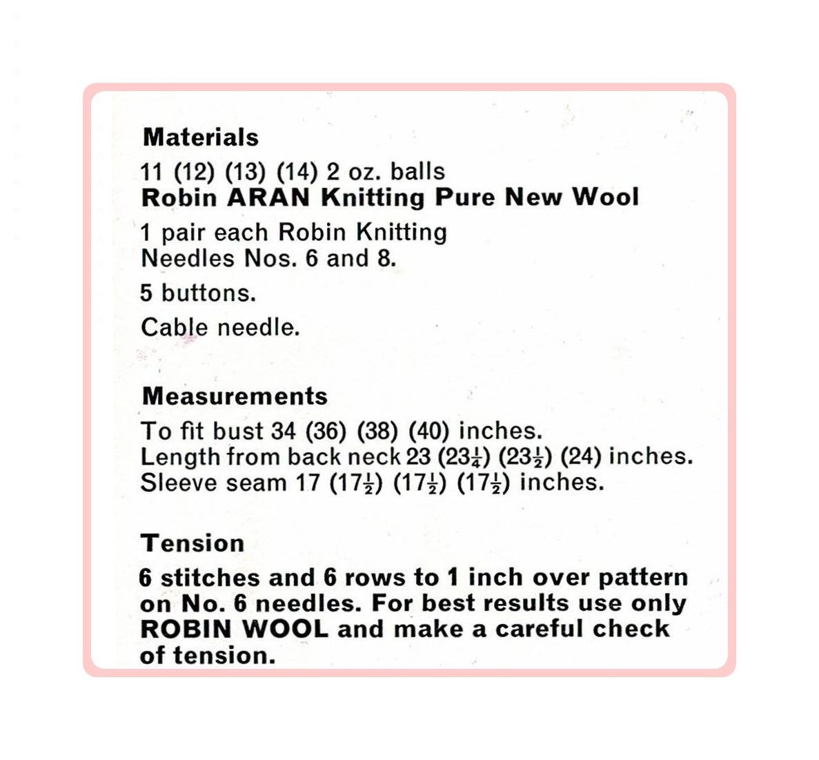 Requires Aran 10 Ply yarn wool, pair of 5mm (UK6/US7) and 4mm (UK8/US5) needles, cable needle, and 5 buttons.