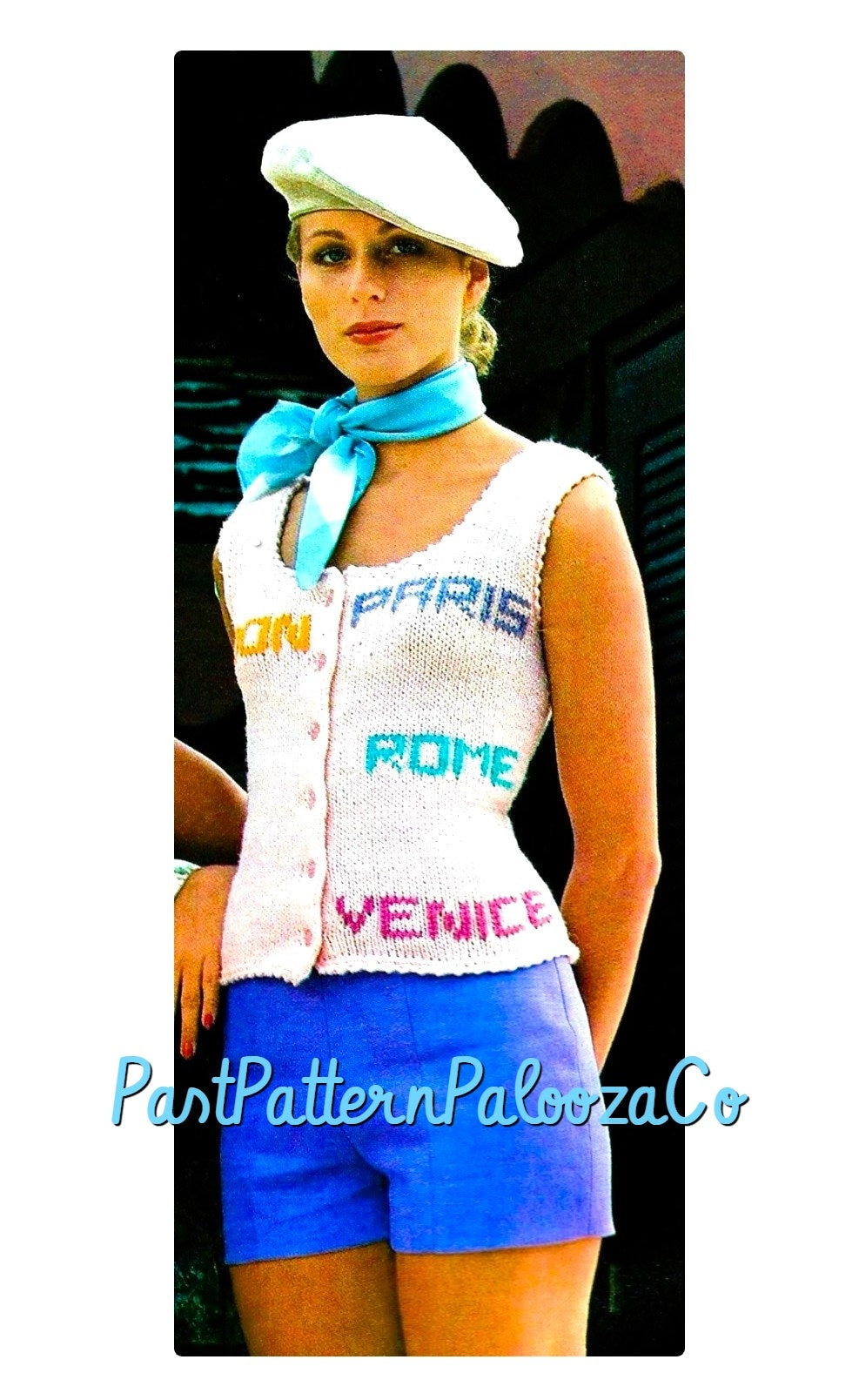 Vintage Knitting Pattern Womens Retro City Name Top Paris London Rome Venice Vest PDF Instant Digital Download 1970s Summer Tank Cardi