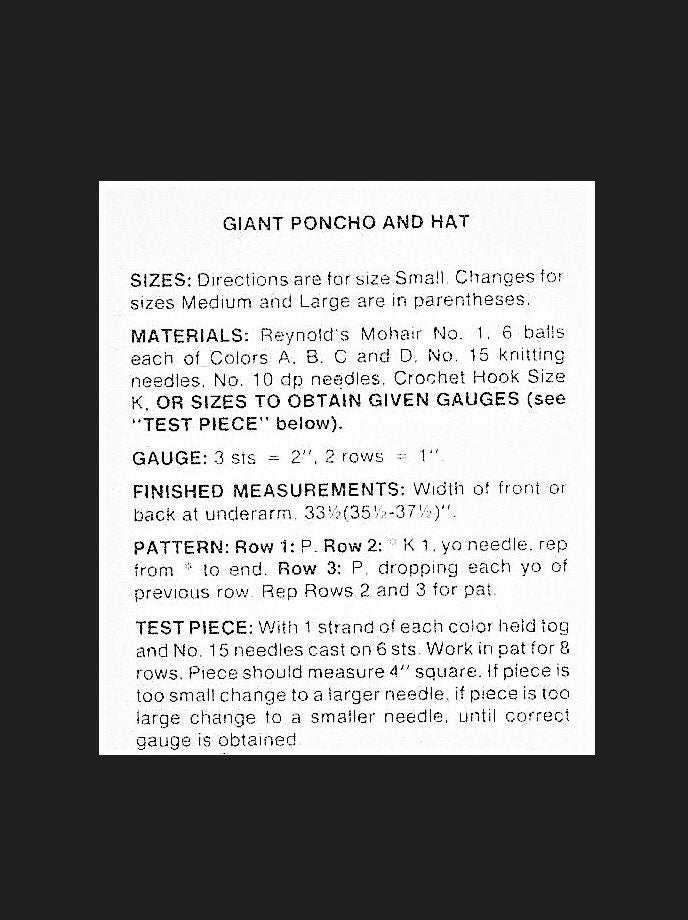 Offering a vintage PDF knitting pattern to make a fun and cosy Jumbo Stitch Poncho with matching hat in soft angora yarn!