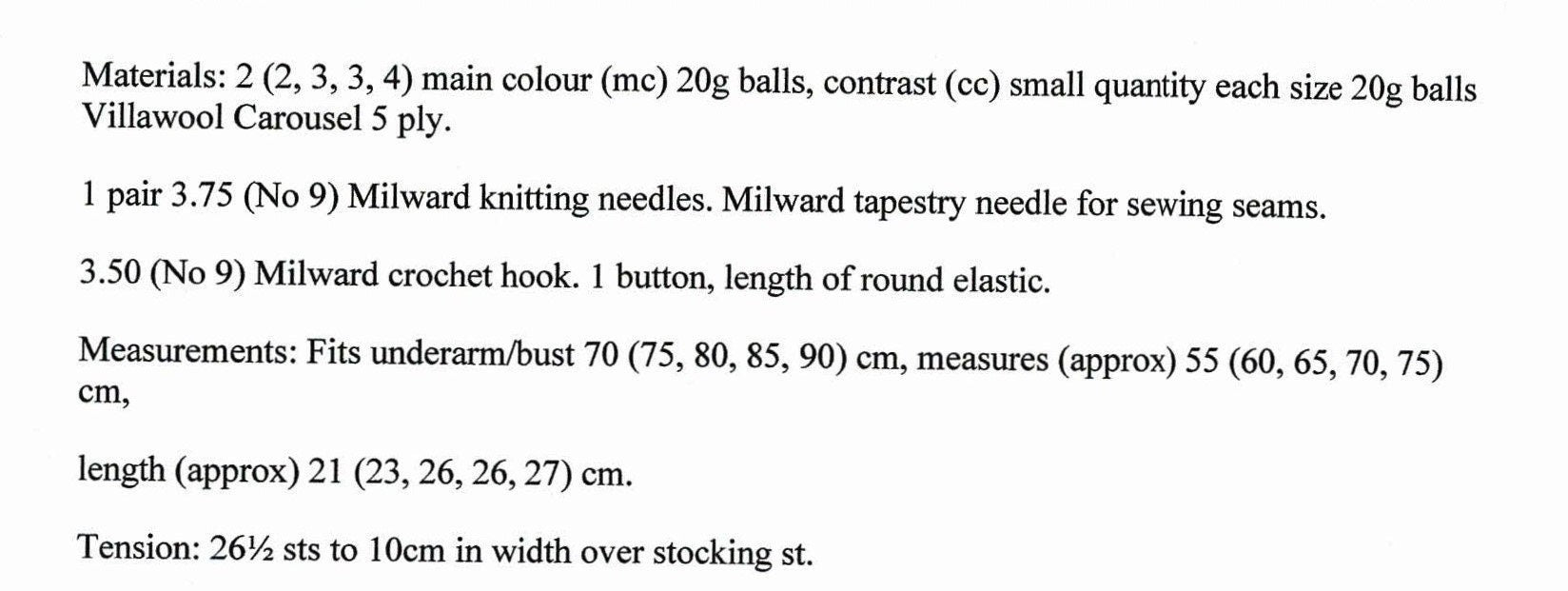 Requires 5 ply sports weight yarn, pair of UK9/US4 3.75mm needles, one E/4 3.5mm crochet hook (for picot trim), 1 button and length of elastic.