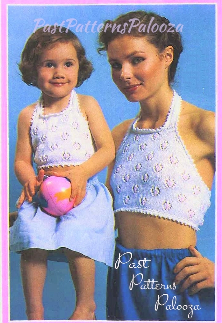 Offering a vintage PDF crochet pattern to make pretty, retro mommy and me midriff halter tops for both ladies and little girls!