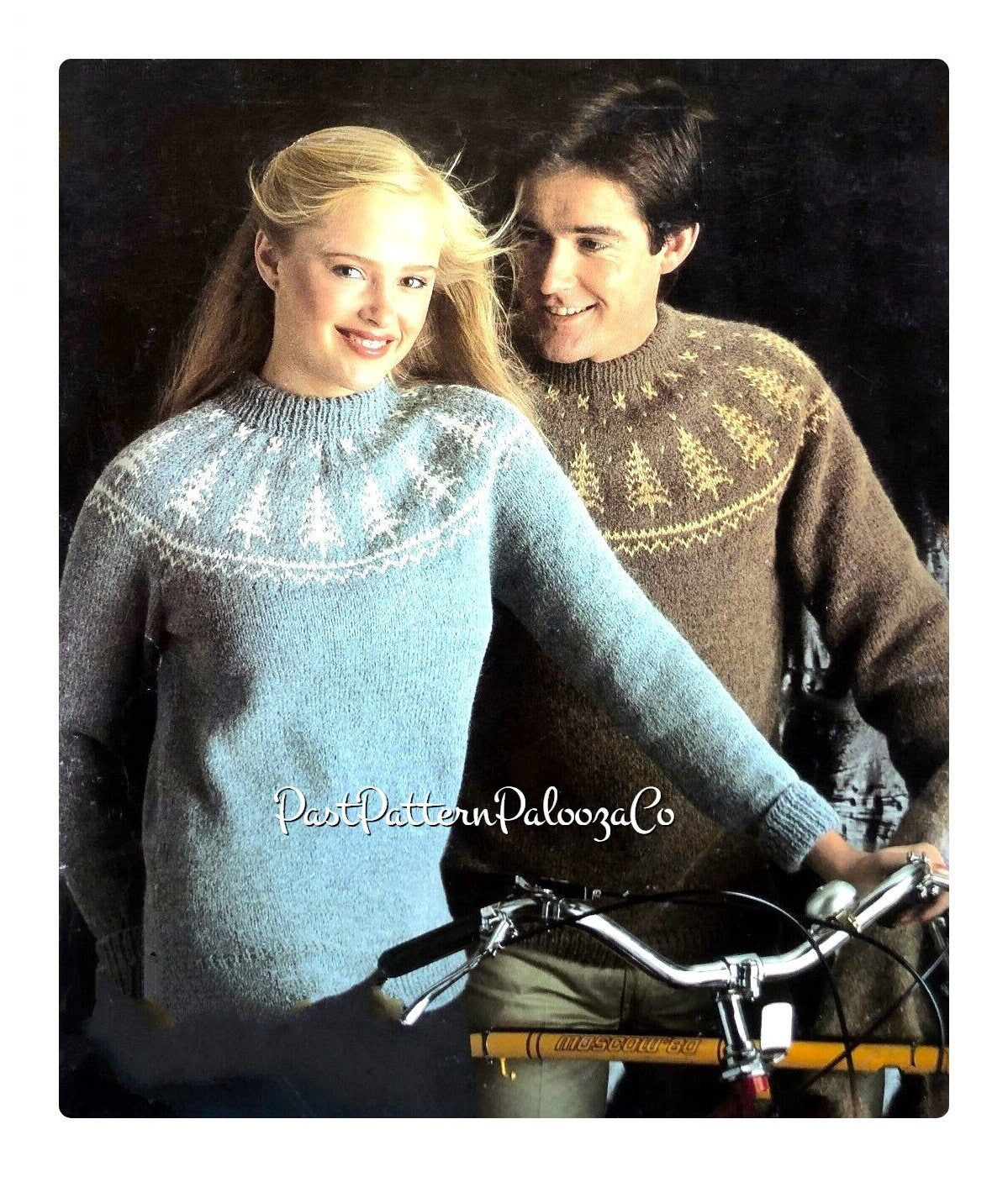 Vintage Knitting Sweater Pattern His Hers Nordic Pine Tree Yoke Fair PDF Instant Digital Download Fairisle Pullover Jumper DK