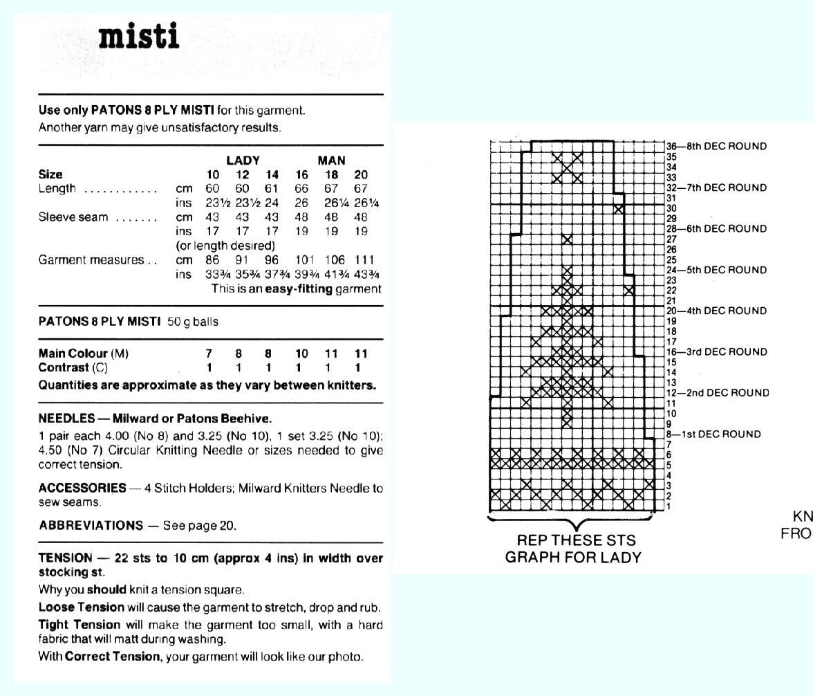 Instructs for three sizes for women and three for men: women's size 10 (12, 14) and men's 16 (18, 20). Chests from 34 - 44 inches.