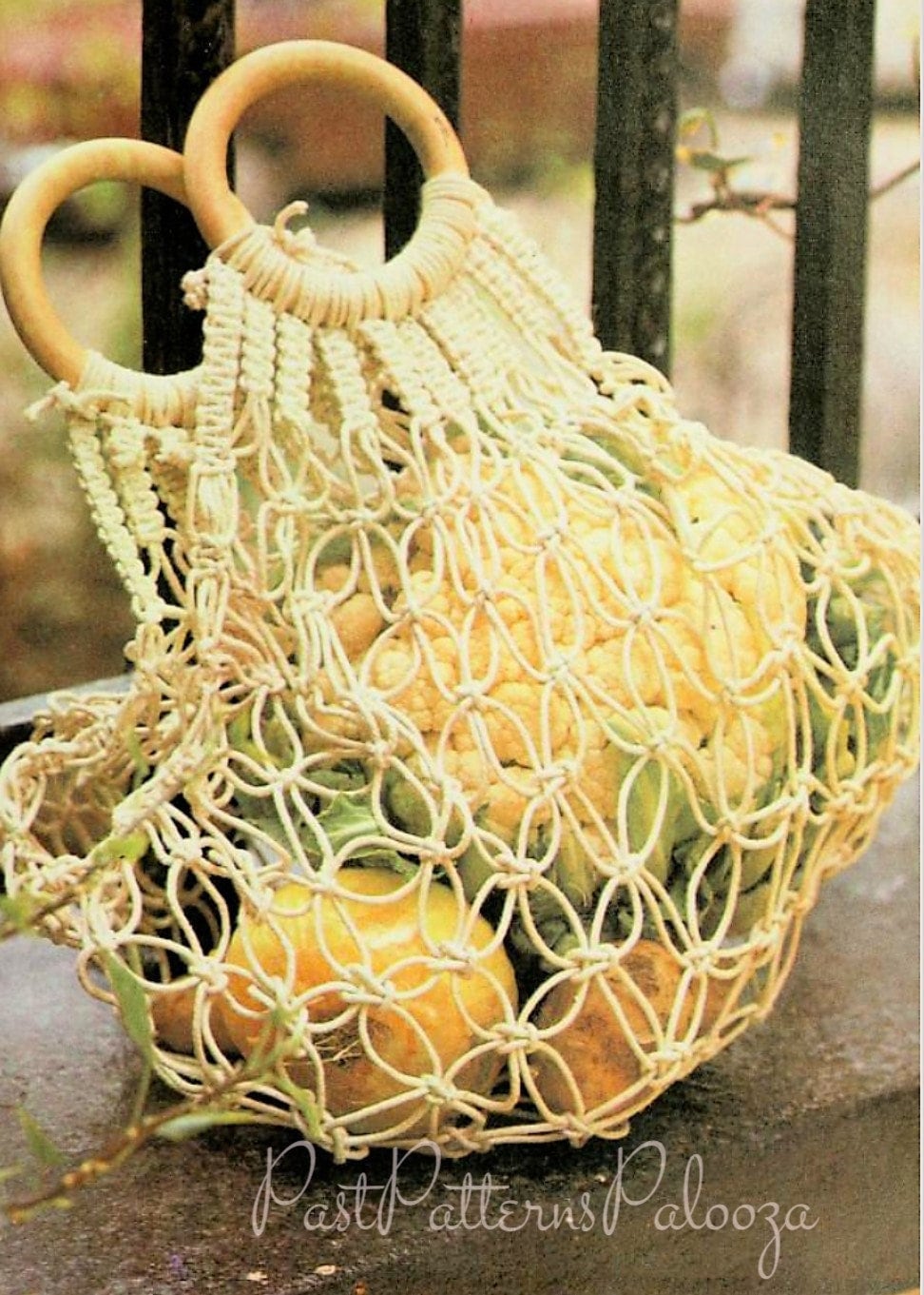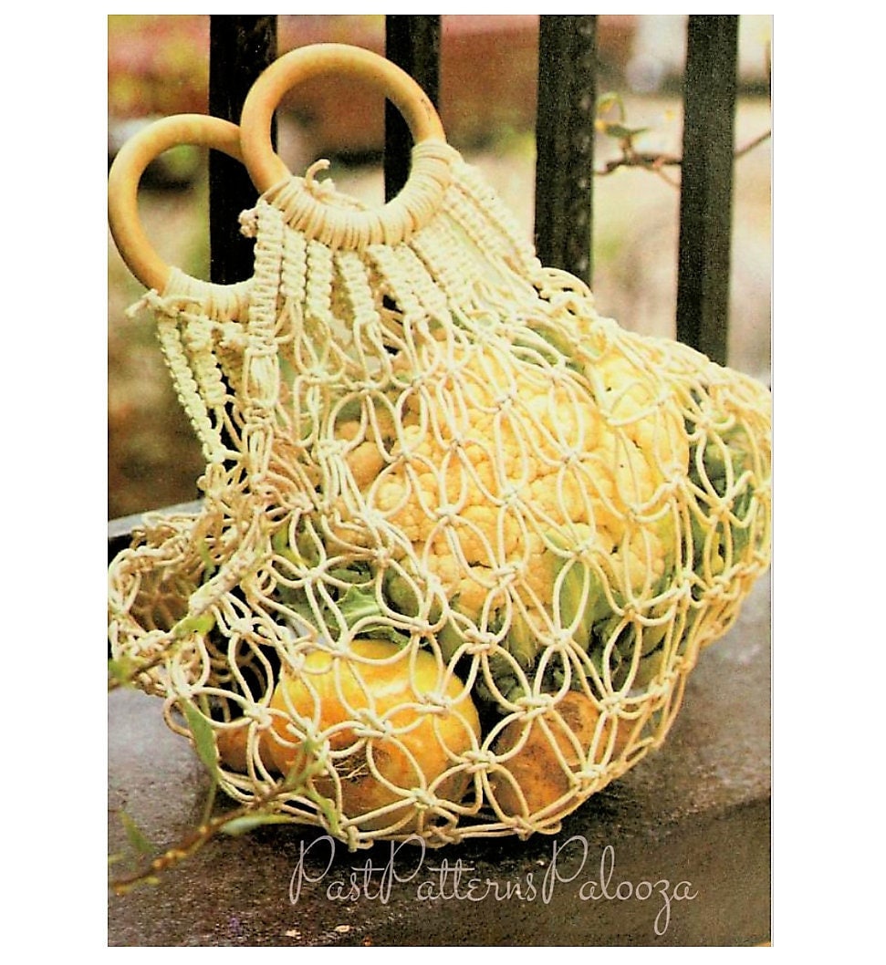 Offering a vintage digital PDF macrame pattern to make a beautiful and functional produce tote bag in parcel string!