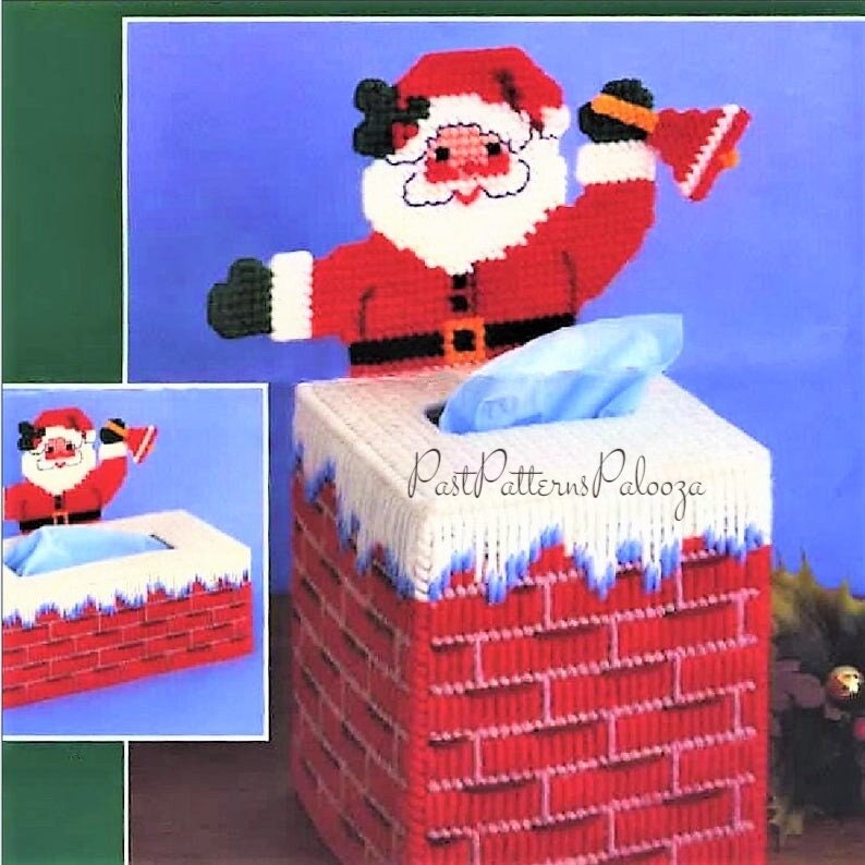 Offering a vintage digital PDF plastic canvas Christmas tissue box cover pattern - Santa going down a chimney!