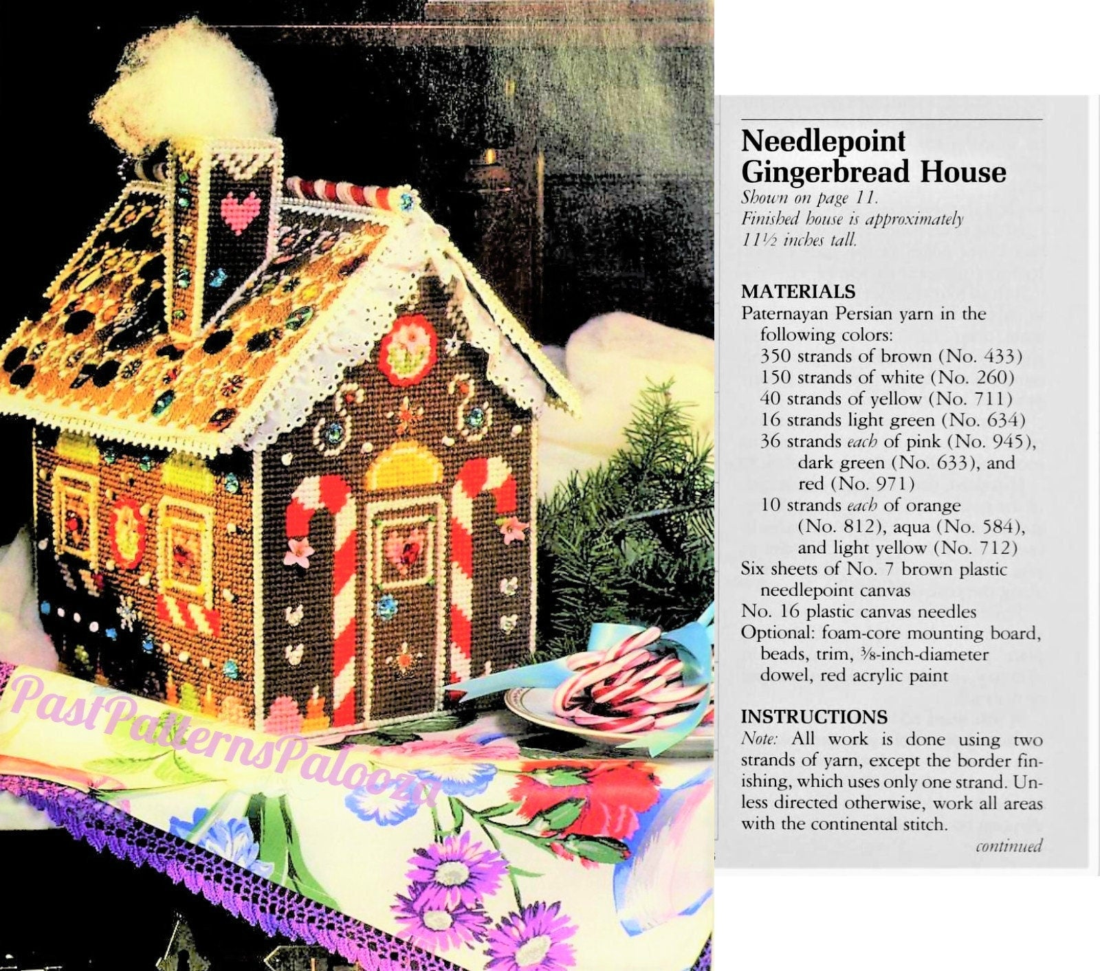 Offering a vintage digital PDF plastic canvas pattern to make a festive Christmas Gingerbread House centerpiece pattern in 7 count!