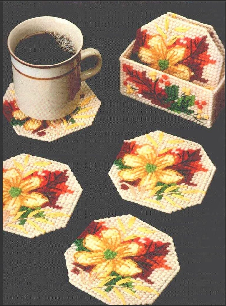 Offering a vintage digital PDF plastic canvas pattern to make pretty Autumn Flowers and Leaves Drink Coasters with holder!