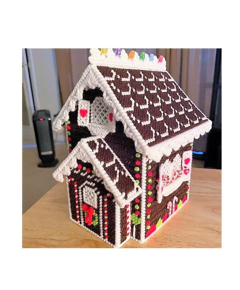 Offering a vintage digital PDF plastic canvas pattern to make a festive Christmas Gingerbread House tissue box cover pattern in 7 count!