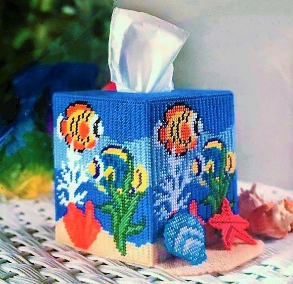 Vintage Plastic Canvas Pattern Tropical Fish Tissue Box Cover PDF Instant Digital Download Ocean Sealife Nautical Tissue Holder