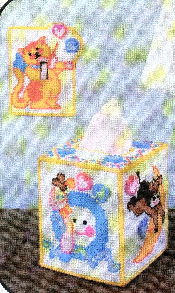 Offering a vintage digital PDF plastic canvas pattern to make a sweet Baby Nursery Rhymes themed tissue cover and light switch plate cover in 7-mesh plastic canvas!
