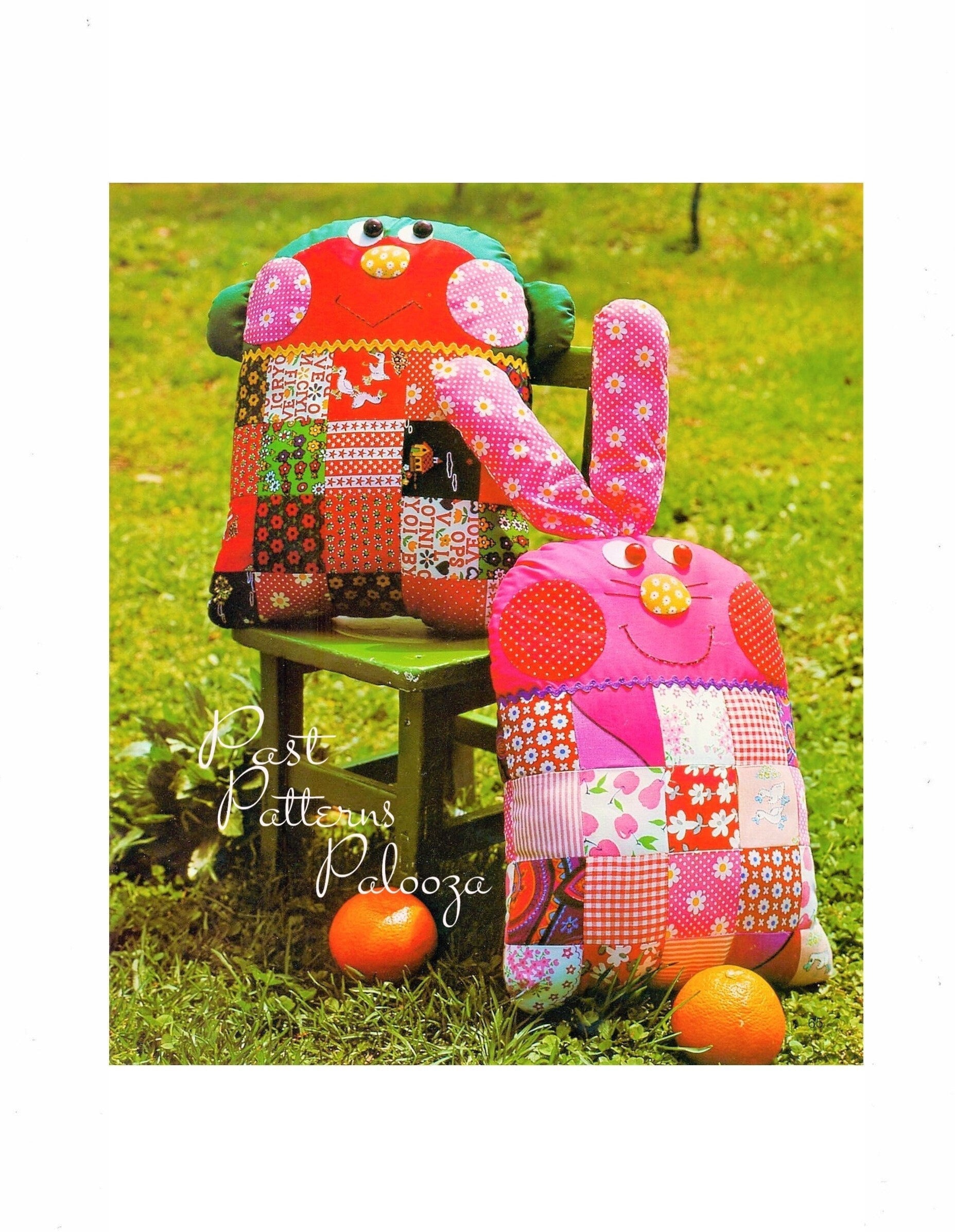 Offering a vintage digital PDF sewing pattern to create two adorable patchwork animal pillows, a cheeky monkey and charming bunny!