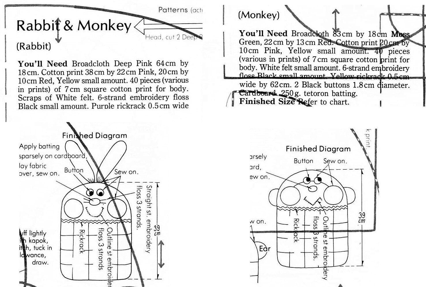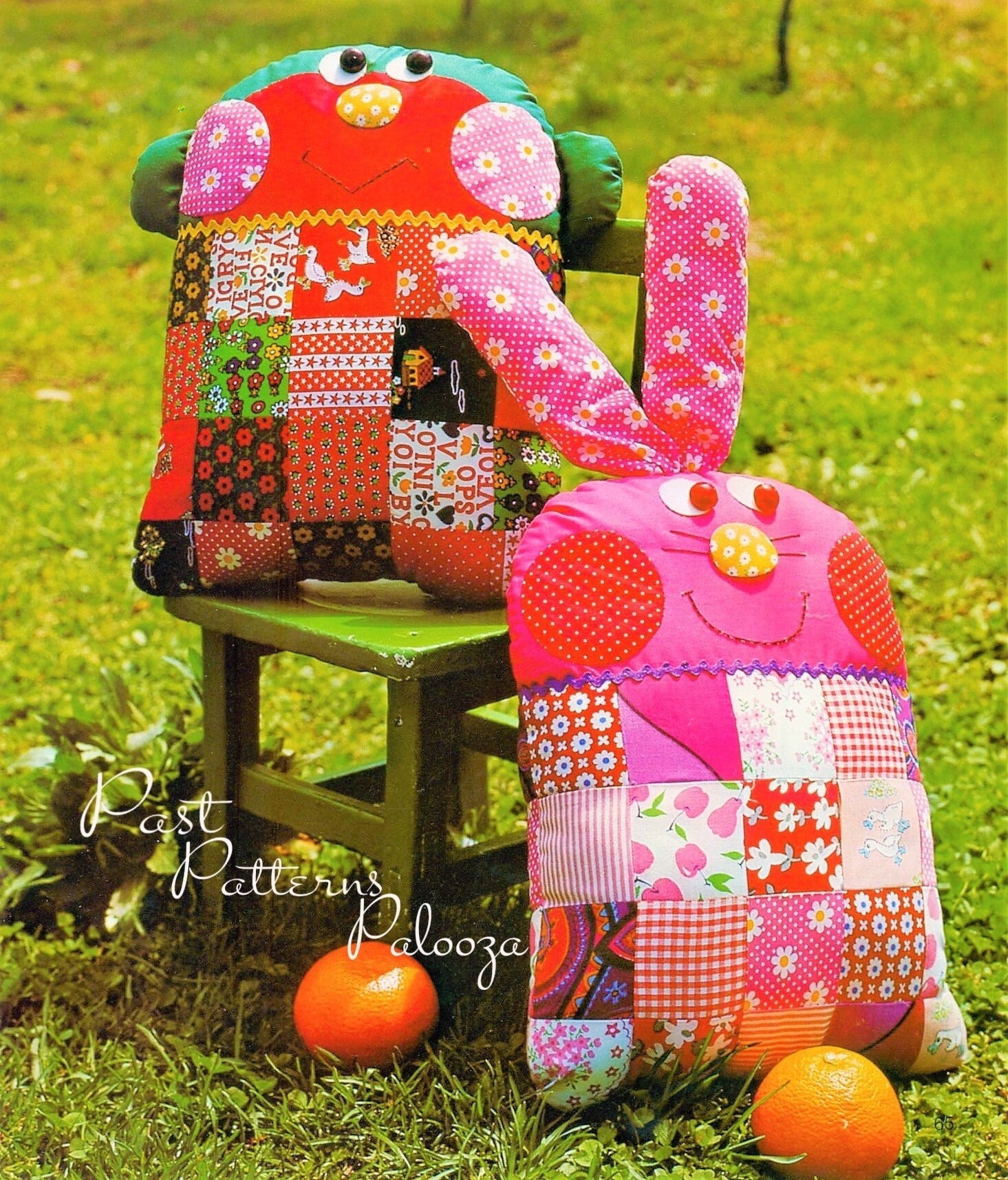 Vintage Sewing Pattern Patchwork Monkey & Bunny Rabbit Memory Pillow Dolls PDF Instant Digital Download Kitsch Retro Soft Toy Animal Cushion