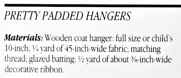 Made using existing wooden hangers, pretty printed fabrics (of your choice) with matching threads, decorative ribbons and batting for stuffing. Scent could be added if desired.
