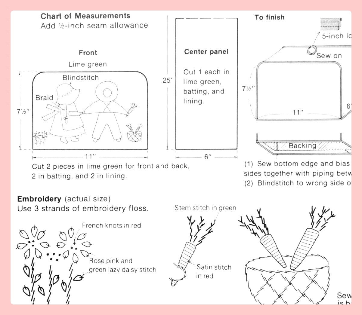 Delightful, retro 1970's pattern contains written directions, informative illustrations and applique template.