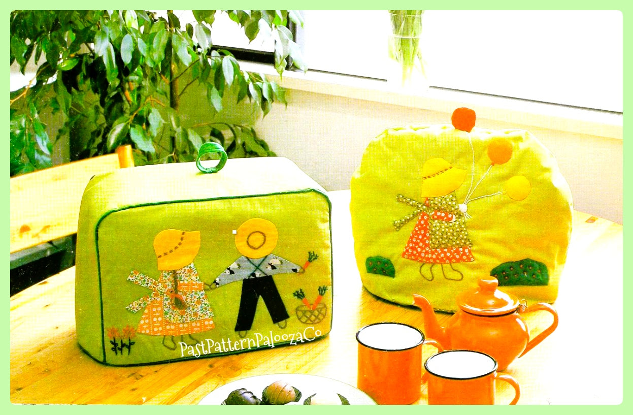 Offering a vintage digital PDF sewing pattern to make adorable Sunbonnet Sue and Overall Sam designed toaster cover, tea cozy and cushions, too cute!!!!