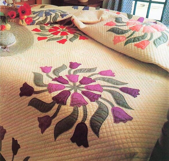 Offering a vintage digital PDF sewing pattern to make a stunning Tulip motif bed quilt!