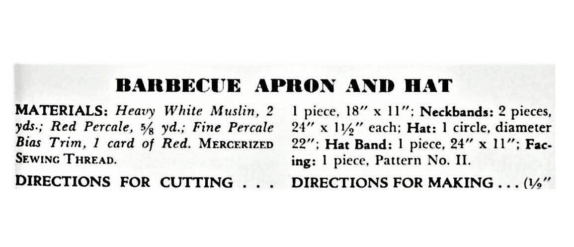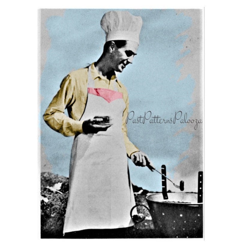 Offering a vintage 1947 instant PDF sewing pattern to make a classic men's BBQ apron and chef's hat in sturdy cotton muslin!