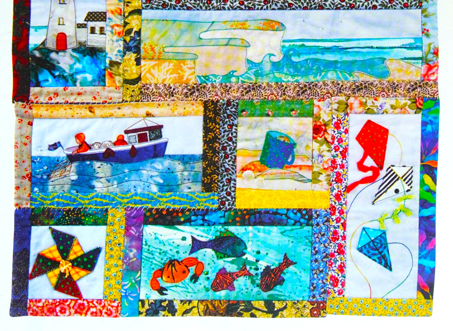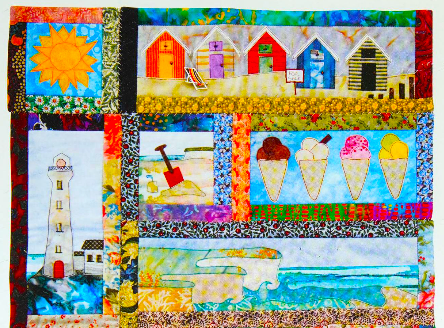 Quilt sections include: Sun, Beach Huts, Shovel, Ice Cream, Lighthouse, Boat, Bucket, Kites, Windmill and Fish & Crab. Truly the nostalgic stuff of childhood summers!
