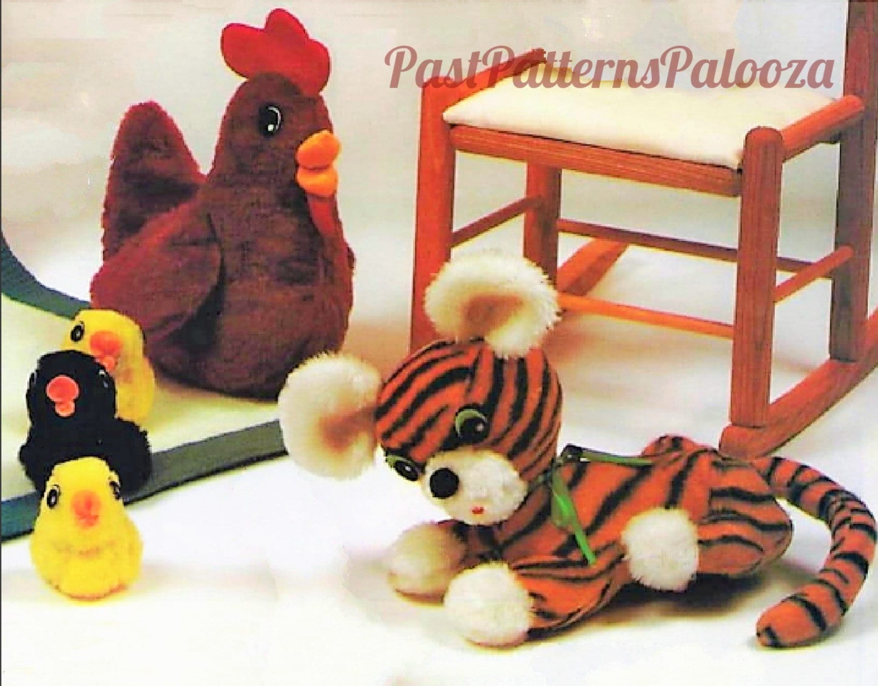 Vintage Sewing Pattern Sewn Tabby Tiger and Hen with Chicks Chickens Soft Sculpture Toys PDF Instant Digital Download Plush Animal Toys