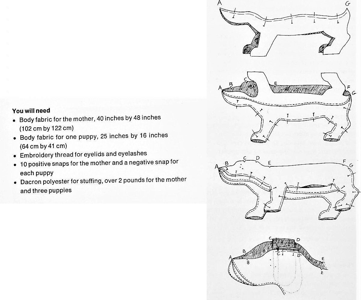 Pattern includes step by step written directions with plenty of illustrations and charted pattern piece templates. Pattern contains gridded diagram pieces that will need to be enlarged via a copier or other means. ( 1 square = 2 inches for mom and 1 inch for pups).