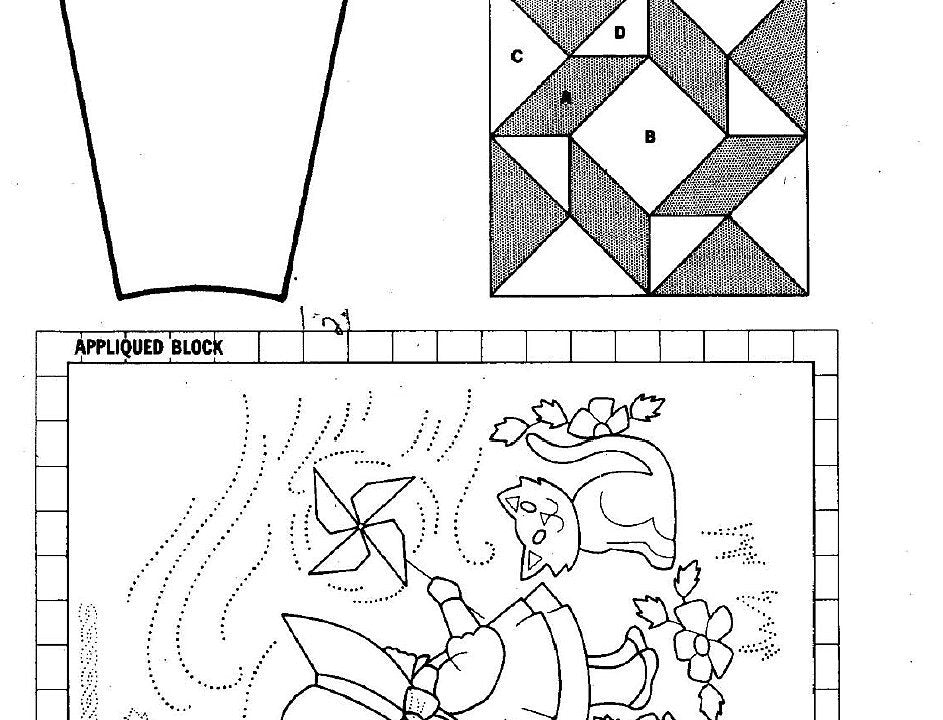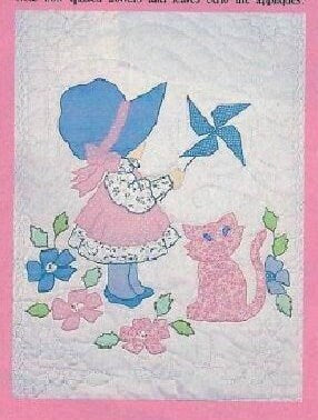 Sunbonnet Sue, complete with polka-dot pinwheel and pet kitty cat, is framed by a quilted chain and 14 Windblown Star blocks. Done in pretty pastel solids and ginghams (or fabric scheme of your choice). The edge is scalloped in Dresden Plate patchwork and appliqued flowers.
