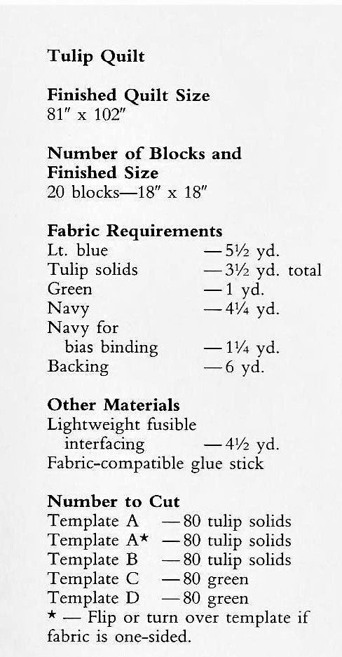 Placed like vanes of a windmill, multicolored tulips are appliqued four to a block - so pretty! Original pattern was made with machine-appliqued tulips but template pieces are given with seam allowance for those who prefer hand-applique :).
