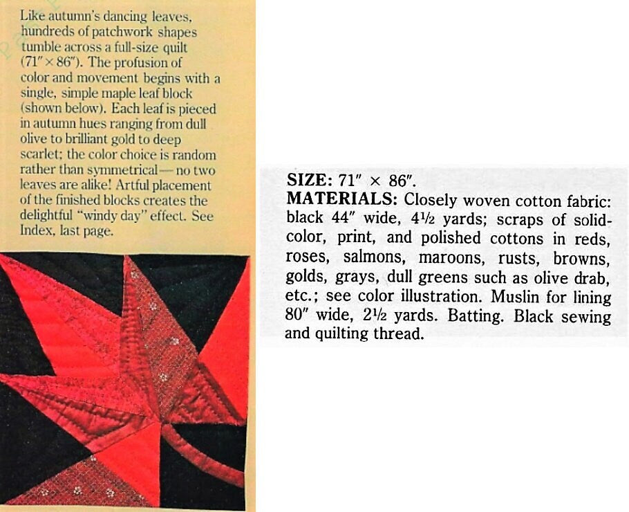 Constructed of hundreds of patchwork shapes pieced onto Maple Leaf blocks to create visual movement of the leaves, so pretty :).