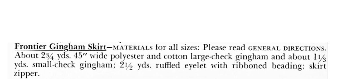 Can be made in any size, with indication for you to adjust fabric accordingly. Requires large and small check poly/cotton gingham fabric, ruffled eyelet, skirt zipper, sewing needle and thread.