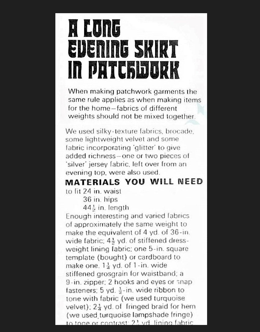Offering a vintage 1970's instant PDF sewing pattern to make a pretty maxi skirt with patchwork scraps!