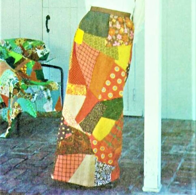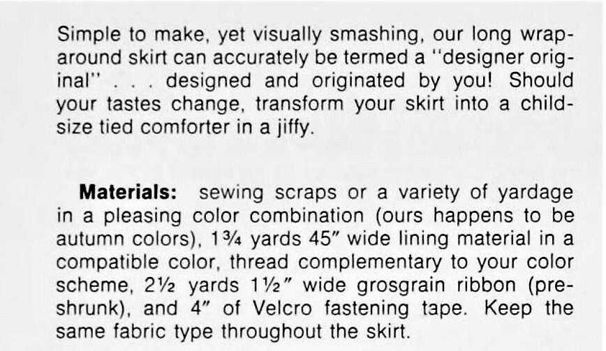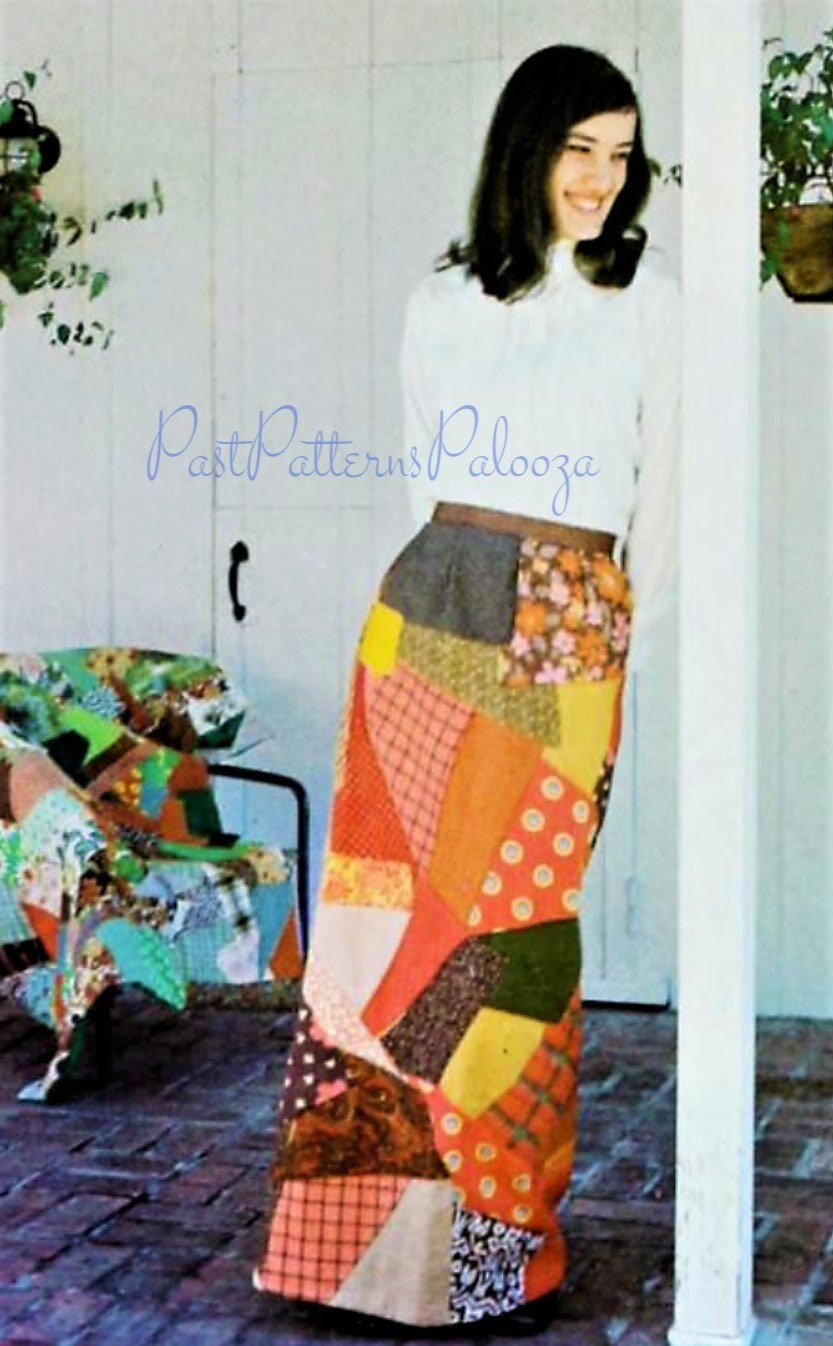 Offering a vintage 1970's instant PDF sewing pattern to make a pretty wrap-around maxi skirt with patchwork scraps!
