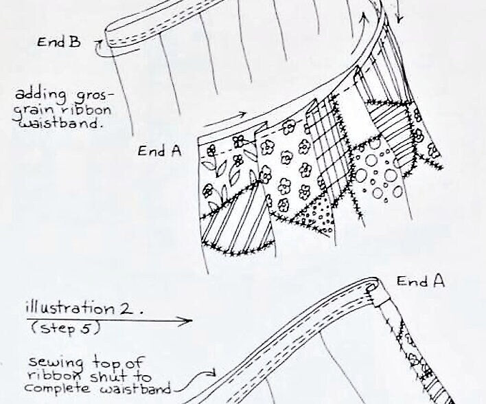 Sizing is not given in this retro pattern but it instructs for Skirt to be made to custom fit any waist by trying on and marking where the overlap falls in the back.