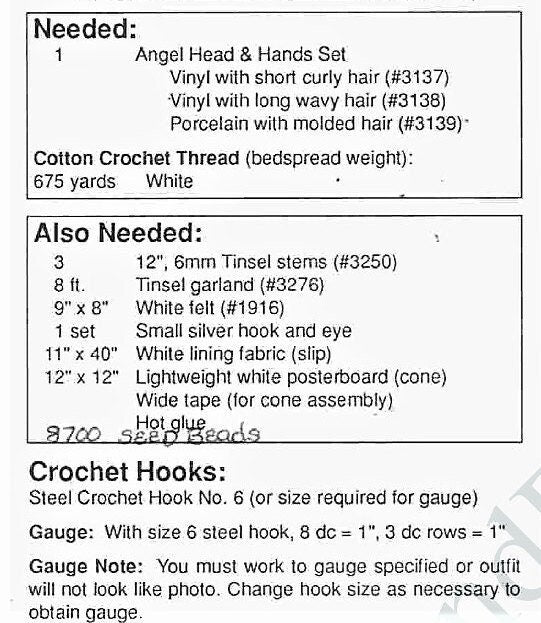 Requires crochet cotton thread, craft doll hands & head set (vinyl or porcelain) and other materials listed in 4th photo.