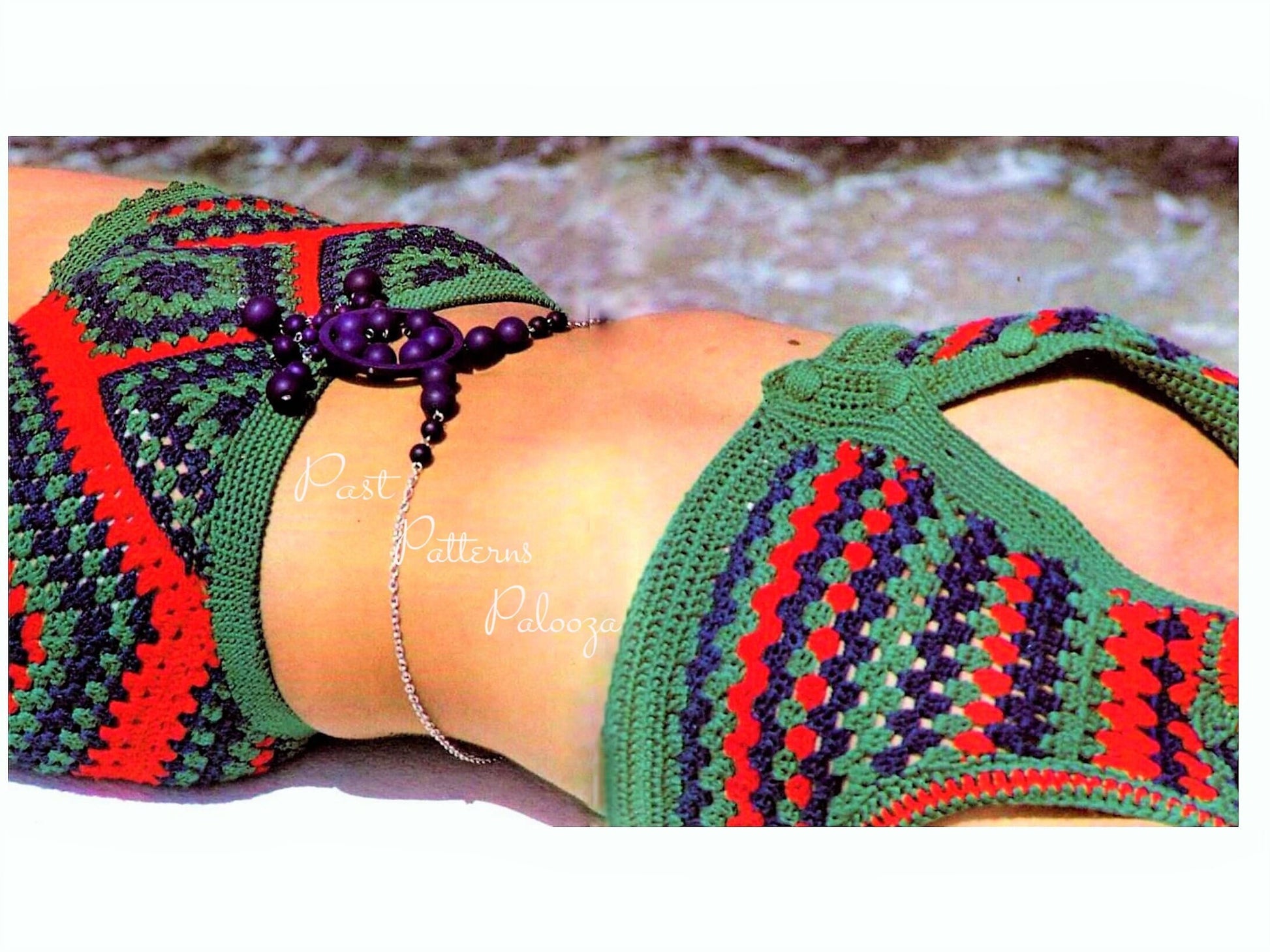 Vintage Thread Crochet Pattern Granny Squares Bikini Crop Top Boy Shorts Play Suit PDF Instant Digital Download Retro 70s Mod Hippie Chic